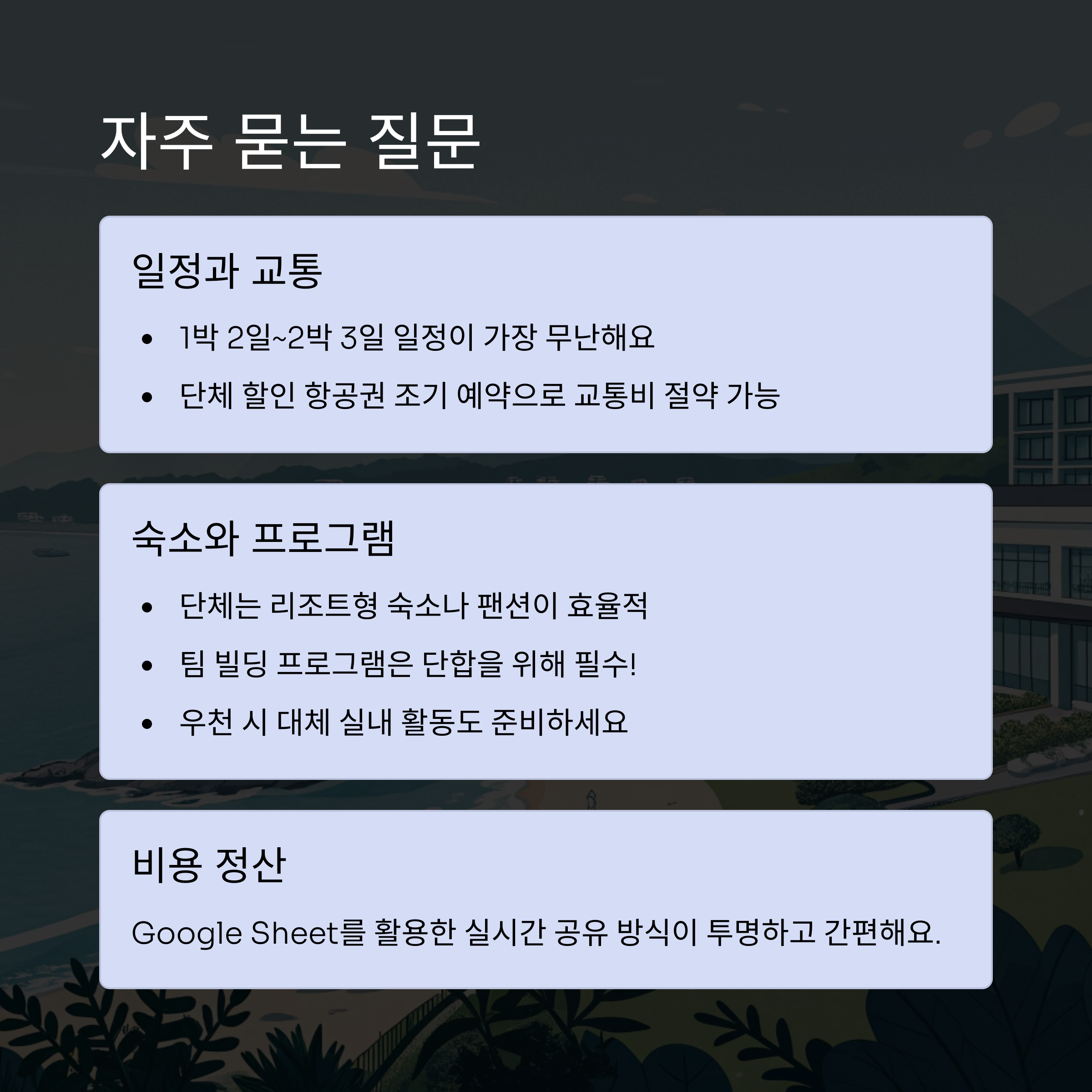 단체일 경우, 리조트형 숙소나 팬션이 비용과 공간 모두 효율적이에요. - 팀 빌딩 프로그램은 꼭 넣어야 하나요?