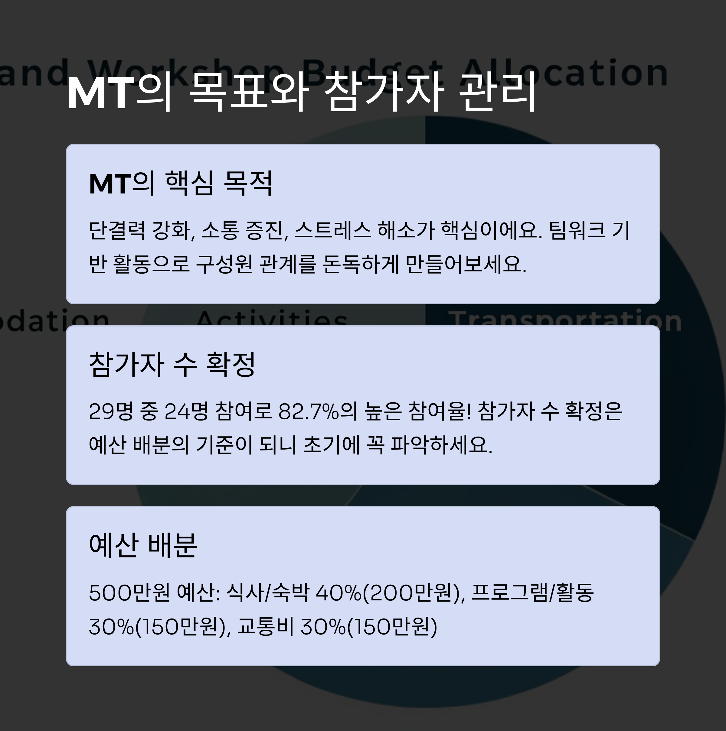 안녕하세요 여러분! 직장이나 동아리, 학회 등 다양한 조직에서 빠질 수 없는 활동, 바로 MT(워크숍)죠. 이번 포스팅에서는 실제 사례를 바탕으로, 29명 중 24명이 참여 예정인 제주도 MT를 어떻게 계획하고 실행하는지 구체적인 가이드로 알려드릴게요! 데이터 기반 접근법부터 예산 배분 팁까지, 실전에서 바로 써먹을 수 있는 정보들만 담았답니다 😊