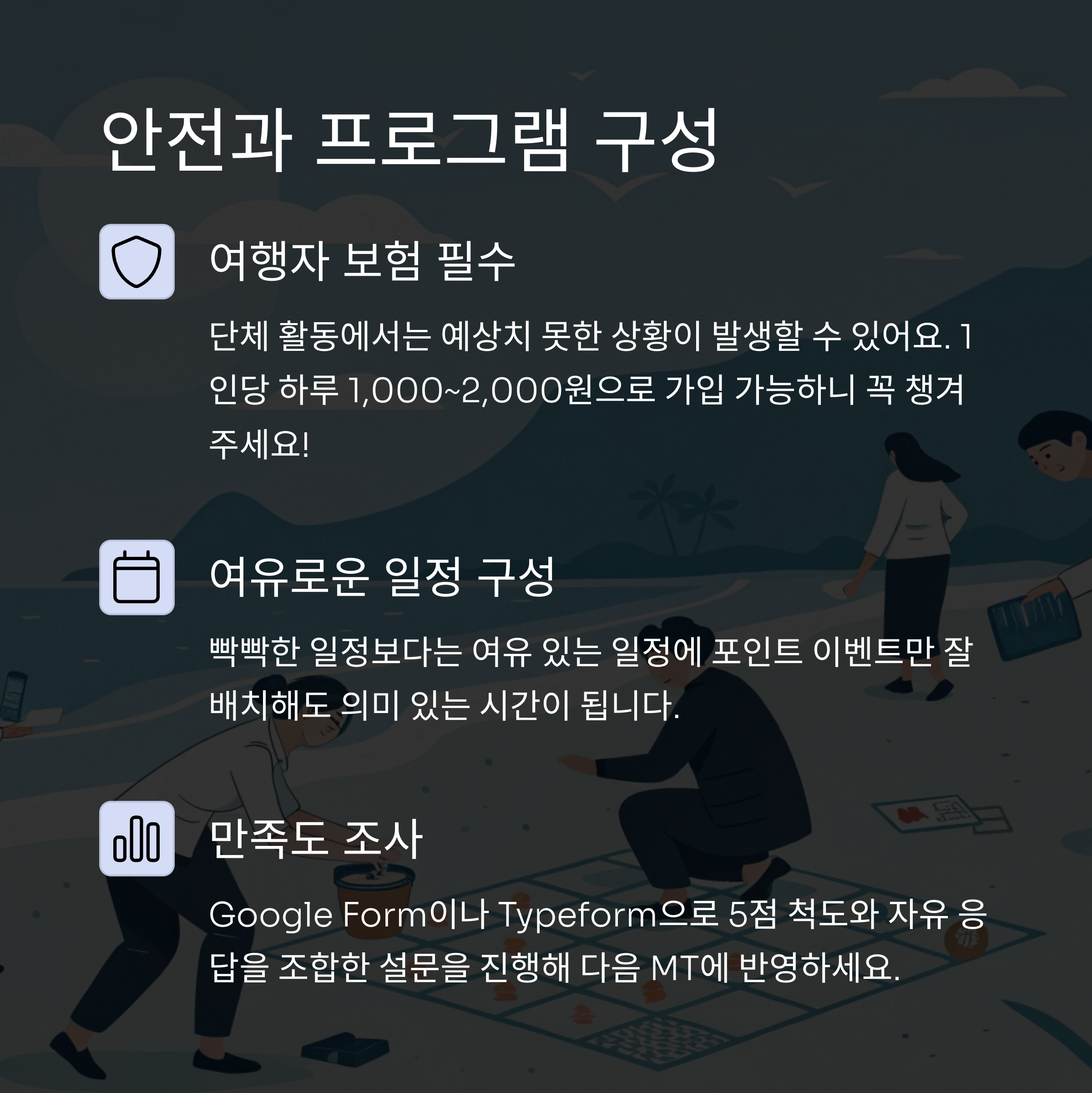 특히 이번 제주도 MT처럼 목적과 인원을 확실히 정하고, 예산과 프로그램을 체계적으로 구성하면 팀워크는 물론 업무 시너지까지 쑥쑥 올라간답니다.