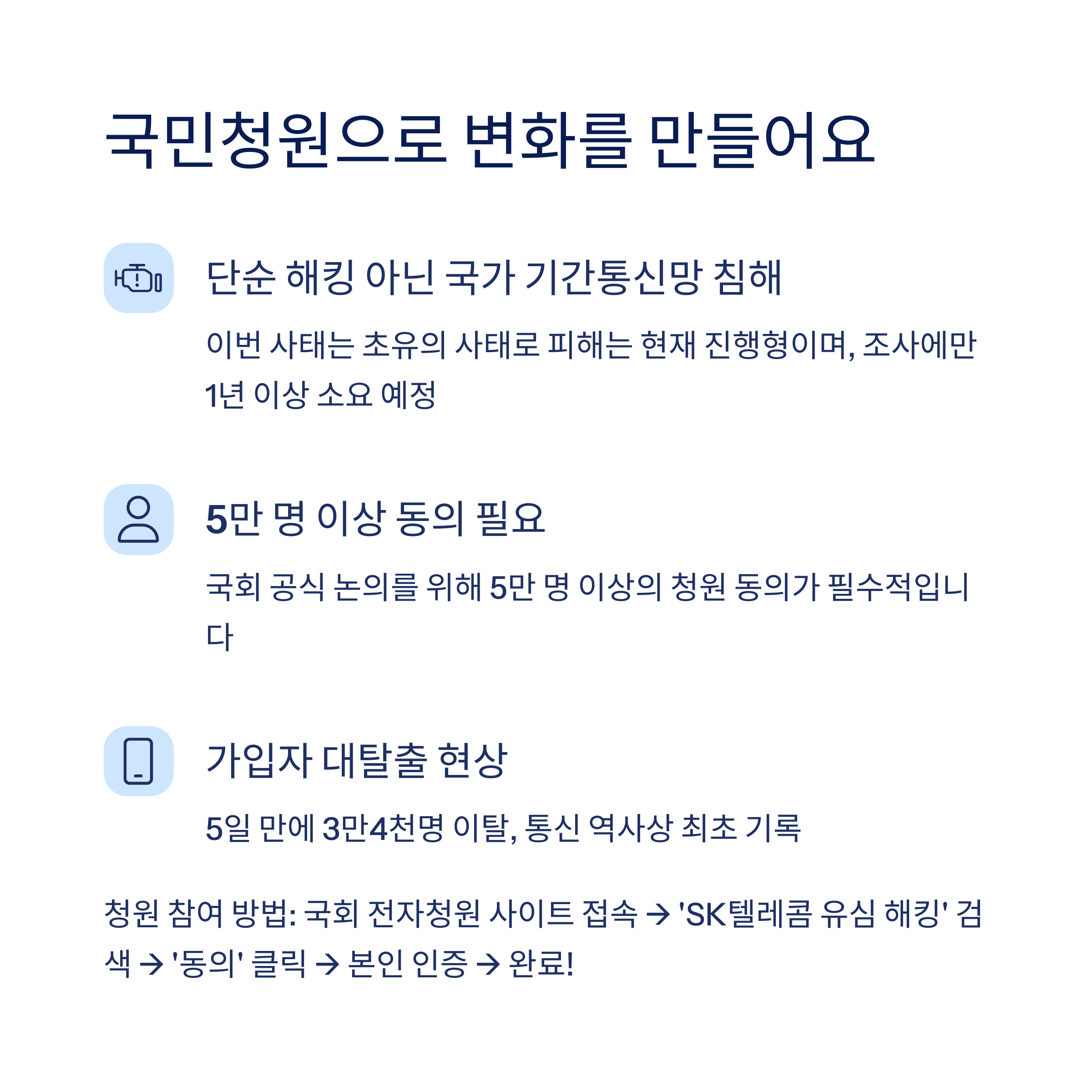 1. 국회 전자청원 사이트 접속 2. 'SK텔레콤 유심 해킹' 검색 3. 청원 내용 확인 후 '동의' 클릭 4. 본인 인증(PASS, 공동인증서 등) 5. 동의 완료되면 자동 등록! 중복 참여는 불가하고, 본인 인증이 필수입니다!